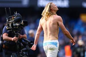 曼城球迷“水瓶哥”赛后狂欢!手持阿森纳水瓶比划“枪手落泪”