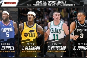 上述4人中,除凯尔登外都拿到了当赛季的最佳第六人。