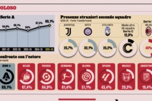 意甲外籍球员比例持续升高,目前69.1%主流联赛仅低于英超、葡超