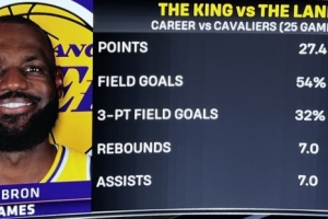 湖人主场迎战骑士,转播方晒出詹姆斯生涯VS骑士数据统计(25场):